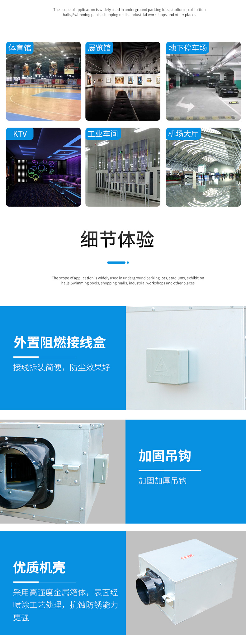 HTF型轴流式消防排烟风机,其基本形式为轴流式结构,电机采用耐高温电机,产品按GA211-2009《消防排烟风机耐高温试验方法》进行耐高温试验,通过公安部消防产品合格评定中心消防产品认证,可在介质温度280℃高温条件下连续运转60分钟以上,100℃温度条件下连续20小时/次不损坏,可通风、排烟两用。