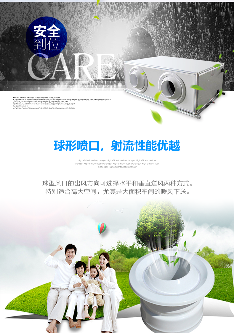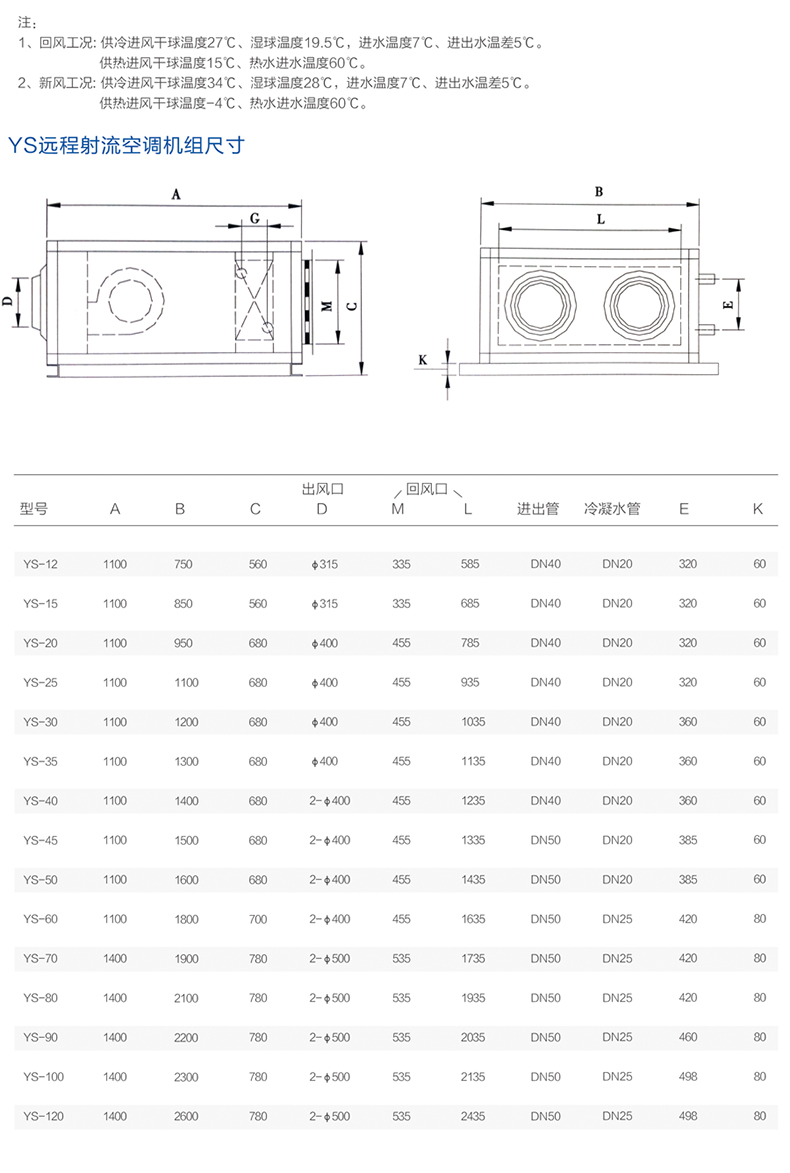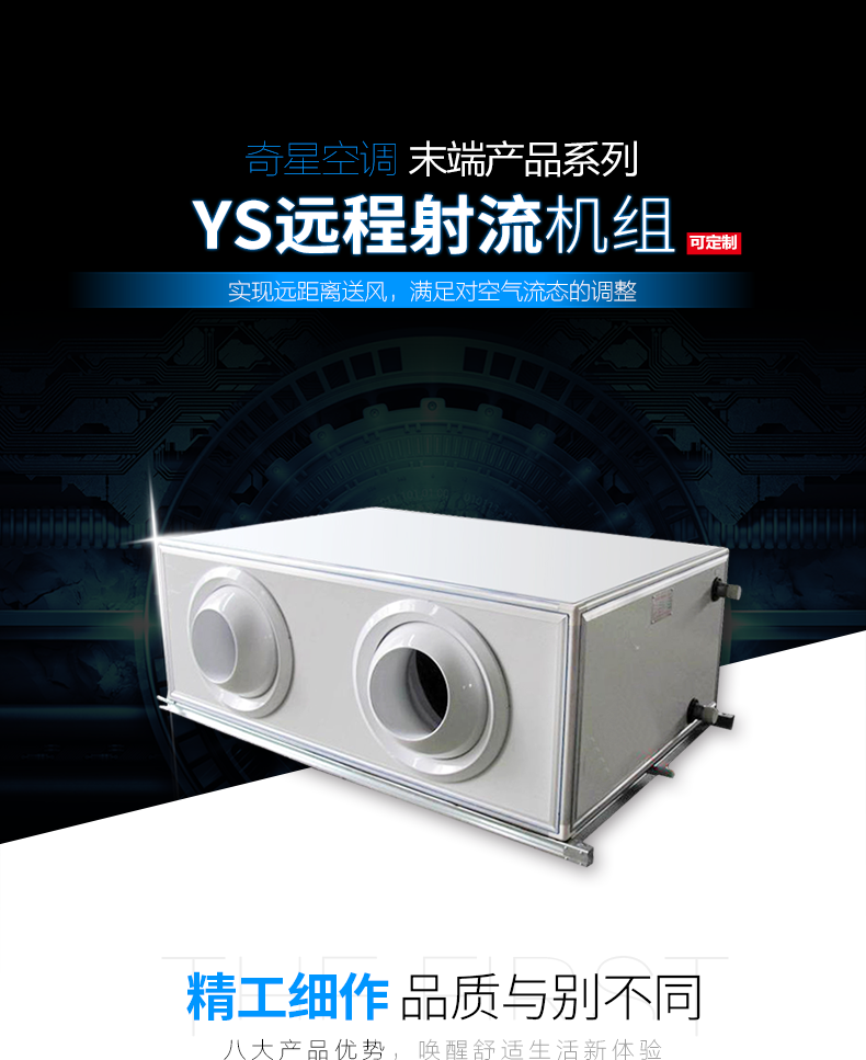 远程射流空调机组主要由可调节变流形风口、换热器、送排风机、过滤器构成。可调节变流形风口兼具球形喷口和旋流风口的特点,在实现远距离送风的同时,又可满足对气流流形的调整。