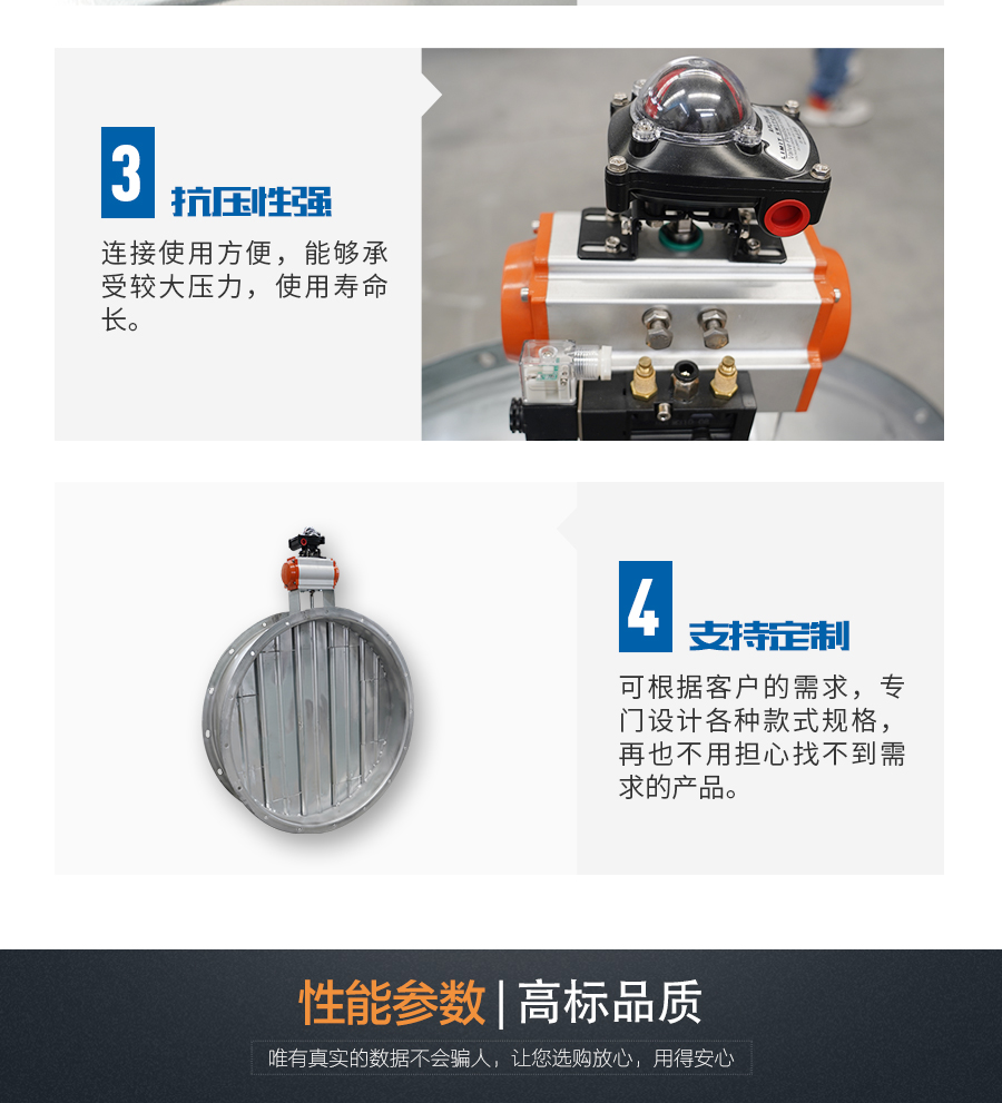 手动风量调节阀采用上装式结构,在高压、大口径条件下减少了阀体自身的连接螺栓,增强了阀门的可靠性且能克服系统自重对阀门正常工作的影响